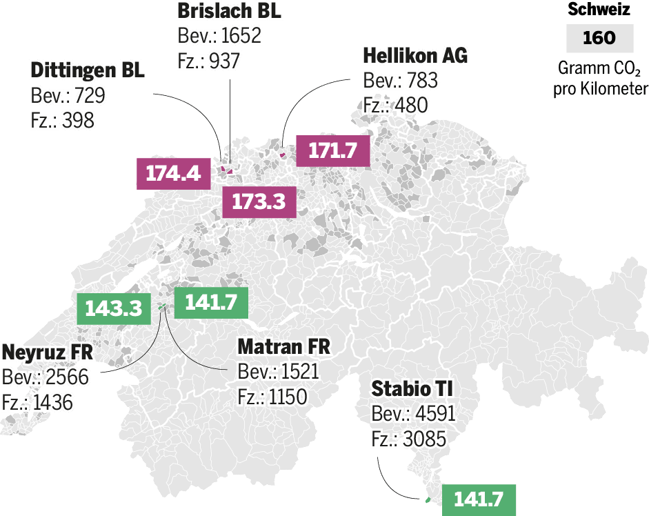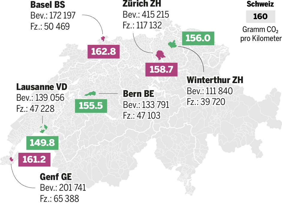 Städter sehen sich gemeinhin als umweltfreundlich. Allerdings gilt dies nicht für alle städtischen Autofahrer, wie die Datenanalyse belegt. So beträgt beispielsweise der durchschnittliche CO₂-Ausstoss der Autos in der Stadt Basel rund 163 Gramm pro Kilometer. Damit liegt die Stadt sogar über dem schweizerischen Schnitt von rund 160 Gramm. Ebenfalls darüber liegt die Stadt Genf.