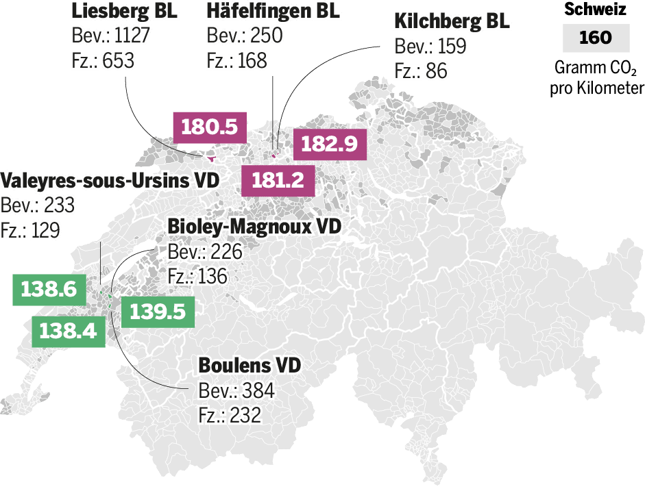 Lesebeispiel: Der durchschnittliche CO₂-Ausstoss aller Autos, die in der ländlich geprägten Gemeinde Kilchberg BL gemeldet sind, beträgt rund 183 Gramm CO₂ pro Kilometer. Das ist über dem Schweizer Schnitt von 160 Gramm CO₂ pro Kilometer.