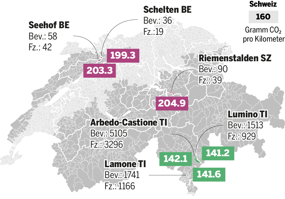 Die Analyse zeigt aber auch, dass es durchaus Berggemeinden gibt, die weniger klimaschädliche Autos haben – beispielsweise im Tessin.