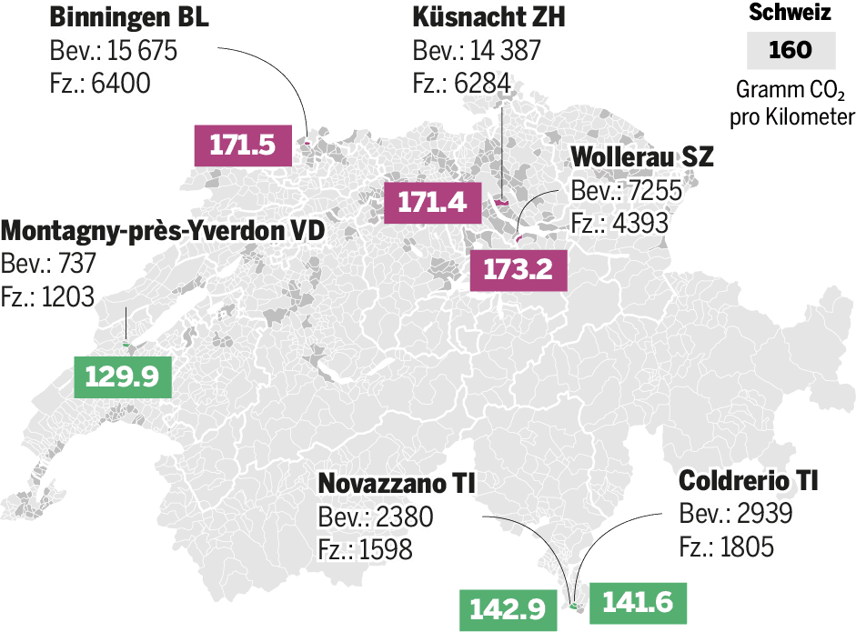 Lesebeispiel: Der durchschnittliche CO₂-Ausstoss aller Autos, die in der städtisch geprägten Gemeinde Wollerau gemeldet sind, beträgt rund 173 Gramm CO₂ pro Kilometer. Das ist über dem Schweizer Schnitt von 160 Gramm CO₂ pro Kilometer.